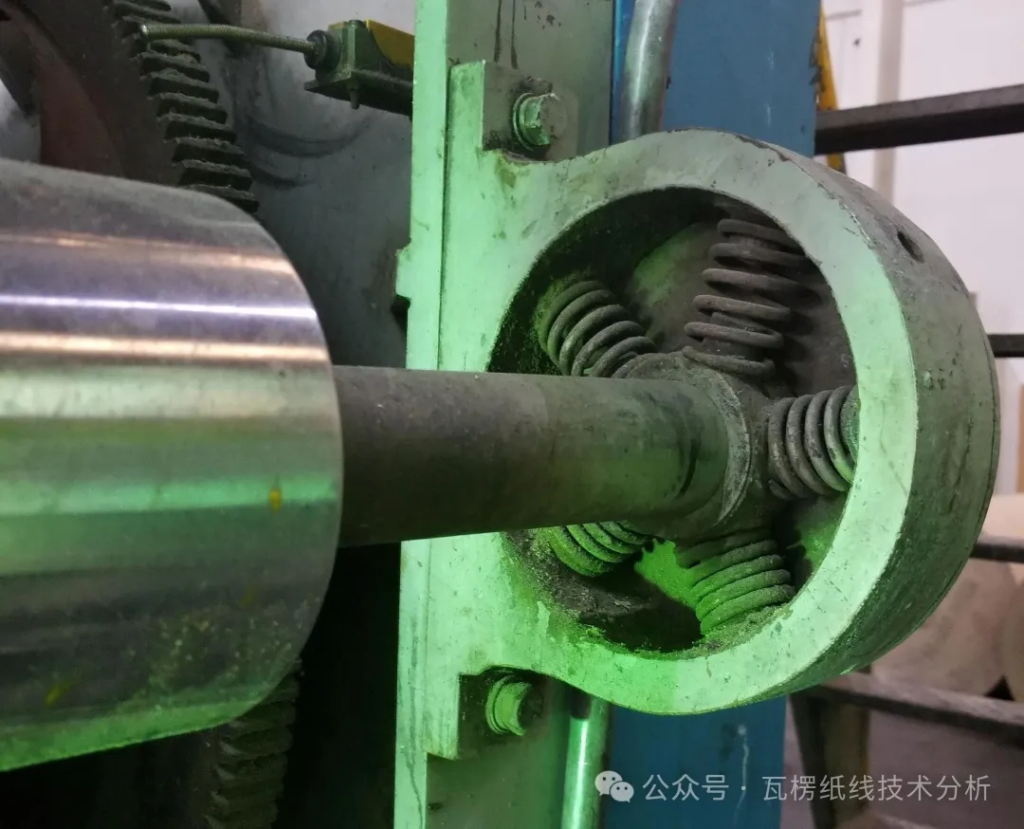 下图是我所知的最早的张力平衡辊,在我的多年从业经历中也只在现场见过一次。从图中的弹簧圆周分布可知,辊轴的摆动方向及受力就是一个玄学。辊轴的摆动方向没有机械限定,弹簧的弹力也不线性,移动方向完全看瞬时受力情况。