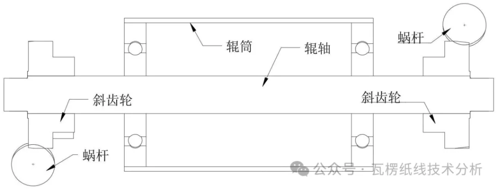 如图所示,左右两侧都是斜齿轮与蜗杆啮合结构。按照辊轮摆动圆心在辊轴中心推算,此斜齿轮的齿面应为竖直状态。显然图中不是,也不可能是,因为那样就无法支撑辊轮自重。